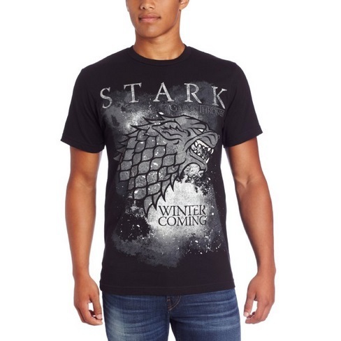 Присоединяйтесь к семье повелителей севера, надев эту замечательную футболку с изображением герба дома Старков, надписью STARK и "Winter is Coming" ("Зима близко").